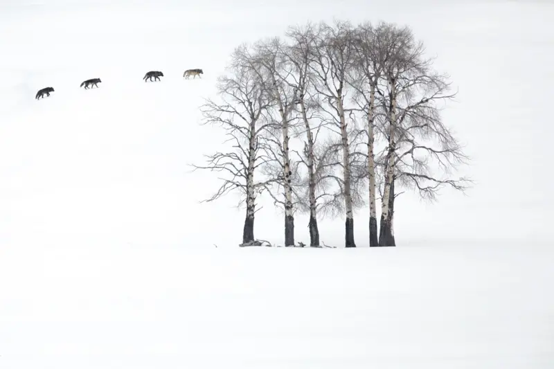 Американский фотограф Девон Прадхуман запечатлел четырех серых волков, пересекающих заснеженную осиновую рощу в Йеллоустоне.