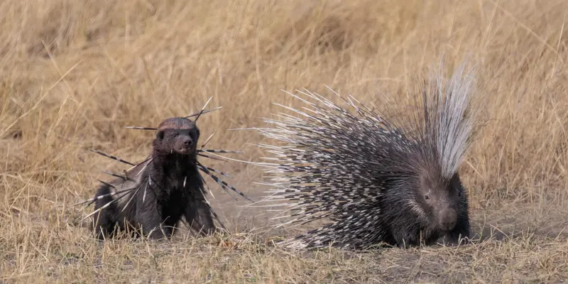 Окровавленный, но решительно настроенный медоед преследует капского дикобраза в Ботсване.