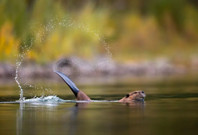 Американский фотограф Саванна Роуз запечатлела бобра, резко ударившего хвостом в Джексоне, штат Вайоминг. Это защитное поведение, предупреждающее членов семьи о появлении незнакомцев.
