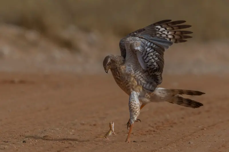Южноафриканский фотограф Вилли Бургер ван Шалквик запечатлел, как гигантский наземный геккон противостоит бледному ястребу-тетеревятнику. Несмотря на мужественную борьбу, у геккона не было шансов выжить.