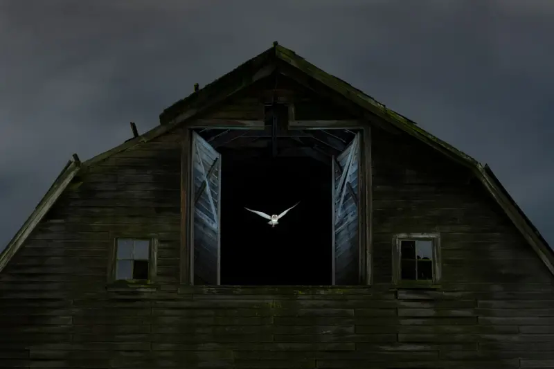 На этом потрясающем снимке сова вылетает из старого амбара, чтобы поохотиться в полях неподалеку от Ванкувера.