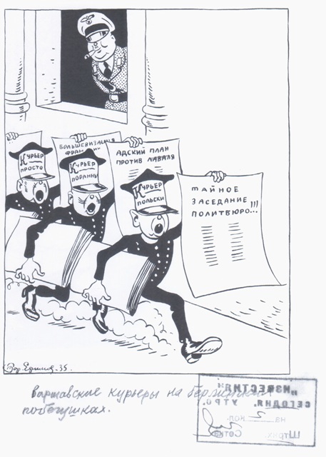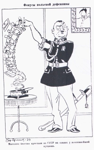У пачатку 1930‑х гадоў гэты ж мастак зрабіў некалькі прац на “польскую” тэму. На іх польскі вайсковец у рагатыўцы пазіраў на савецкі бок, ці афіцэр Войска Польскага абдымаўся з французскім генералам. Апошні супакойваў калегу: “Не сумневайцеся, пан палкоўнік, Ваш напад на СССР будзе разглядацца як абарончая вайна. Вы будзеце абараняць свае межы 1772 г.”. Дарэчы, гэта бадай адзіная савецкая карыкатура, дзе згадваліся падзелы Рэчы Паспалітай у XVIII ст..