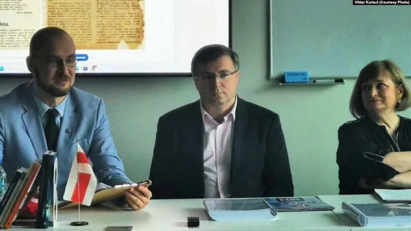 Падчас абароны доктарскай дысэртацыі Віктара Корбута ў Варшаўскім унівэрсітэце. Зьлева направа: Віктар Корбут, навуковы кіраўнік Юры Грыбоўскі, рэцэнзэнтка Эва Галяхоўска. Фота: з сайта «Радыё Свабода»