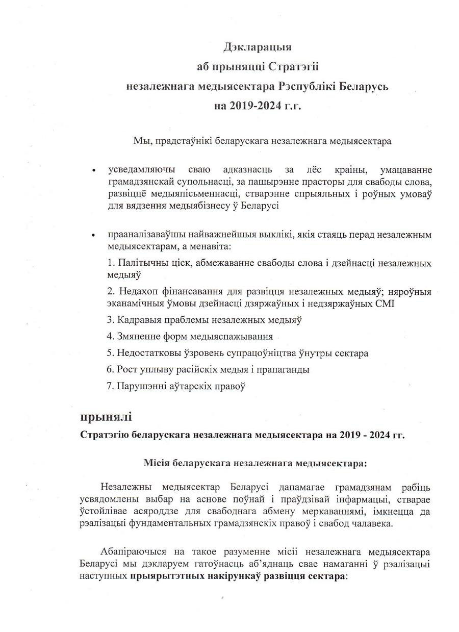 Азнаёміцца са Стратэгіяй і падпісаць Дэкларацыю аб прыняцці Стратэгіі незалежнага медыясектару Беларусі на 2019–2024 гг. можна ў офісе ГА «БАЖ».
