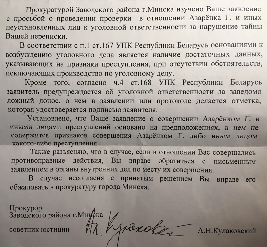 «Устаноўлена, што вашая заява аб здзяйсненні Азаронкам і іншымі асобамі злачынстваў заснавана на здагадках, у ім няма прыкметаў здзяйснення Азаронкам альбо іншай асобай якога-небудзь злачынства», — адзначаецца ў адказе пракурора.