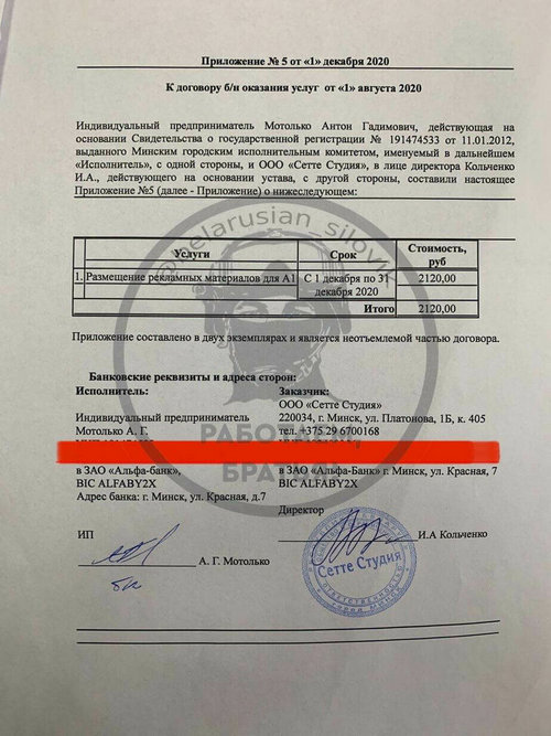 Другі нюанс — ніводная з дамоваў, апублікаваных у канале сілавікоў, не была падпісаная ўласна Брэдзелевым. Матолька заключаў кантракт з PR-кампаніяй «Сетэ Студыя», якая уласна, і была нанятая для піяру А1.