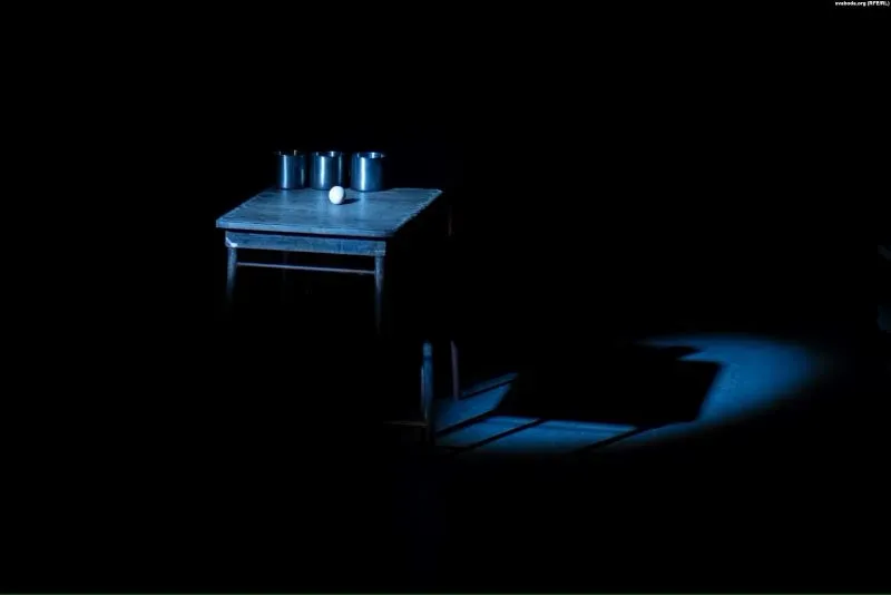 На імправізаванай сцэне — двух’ярусныя нары з «ватай» (на турэмным жаргоне гэта азначае матрац), крываногі столік, на ім «кругалі» (алюмініевыя конаўкі), побач зэдлікі. Каля нараў «кешары» (торбы з рэчамі арыштантаў).