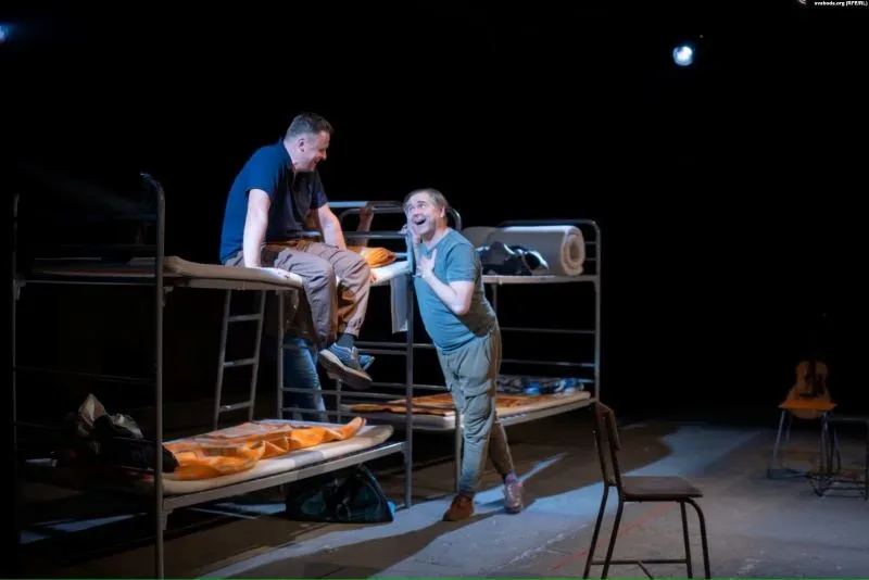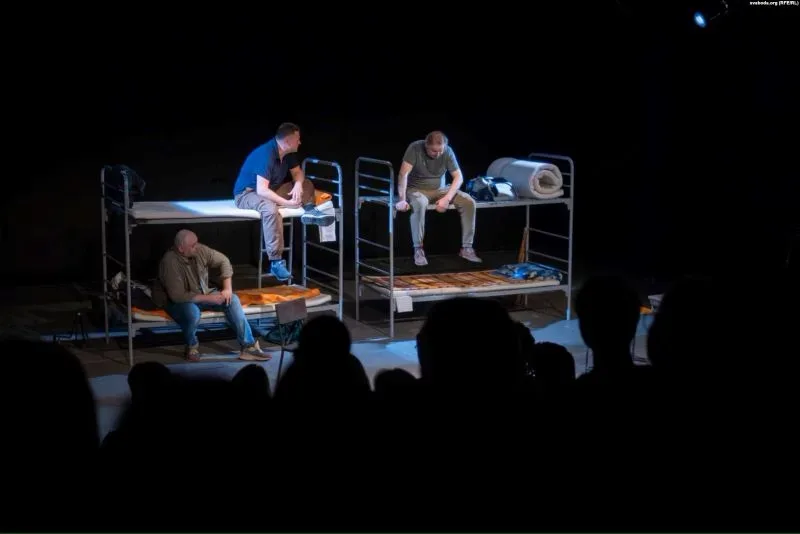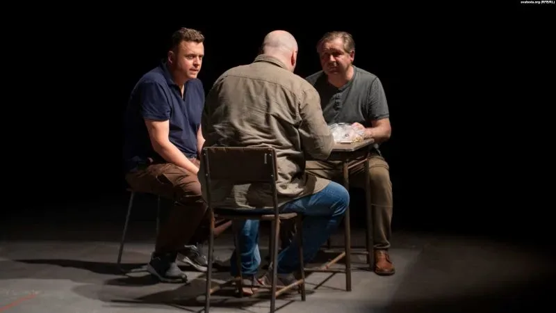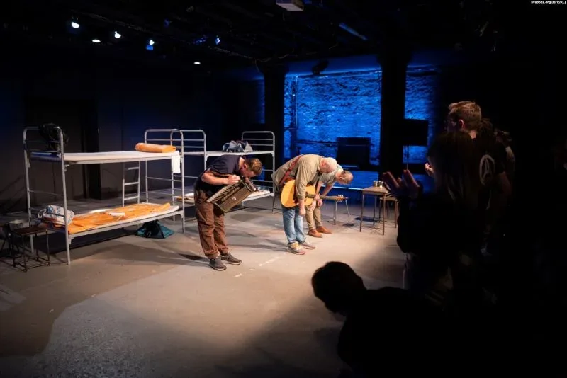 Падчас прэм’еры спэктакля паводле «Зэкамэрона» Максіма Знака. «Купалаўцы» Алег Гарбуз (справа) і Сяргей Чуб (зьлева) і музыка Ўладзімер Пугач (у цэнтры, сьпінай да гледача). Фота: «Радыё Свабода»