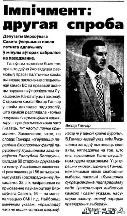 У Беларусі прызналі «экстрэмісцкім» нумар незалежнай газеты «Свабода» ад 17 кастрычніка 1997 года. Адпаведнае рашэнне 21 лютага прыняў суд Мінскага раёна. Якія менавіта прэтэнзіі да нумару, невядома. Магчыма, нейкую крамолу пабачылі ў артыкуле «Імпічмент: другая спроба», прысвечаны сходу дэпутатаў Вярхоўнага Савета Беларусі і выступу на ім Віктара Ганчара«Лукашэнка супрацьзаконна падпарадкаваў сабе Цэнтральную выбарчую камісію і сваімі ўказамі, насуперак закону, змяніў парадак правядзення выбараў», — гаварыў ён. Вярхоўны Савет прыняў заяву пра «наяўнасць у дзеяннях Лукашэнкі прыкметаў злачынства» і прызнаў «немагчымым выкананне Лукашэнкам абавязкаў прэзідэнта Беларусі», пісала выданне.