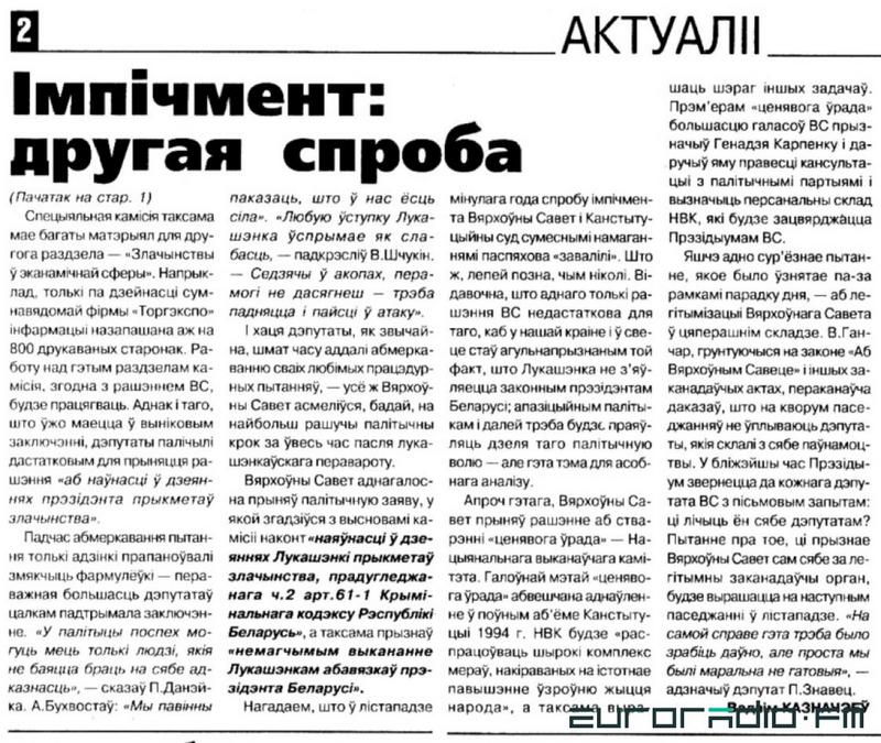 Прызналі «экстрэмісцкім» нумар газеты з артыкулам пра імпічмент Лукашэнку