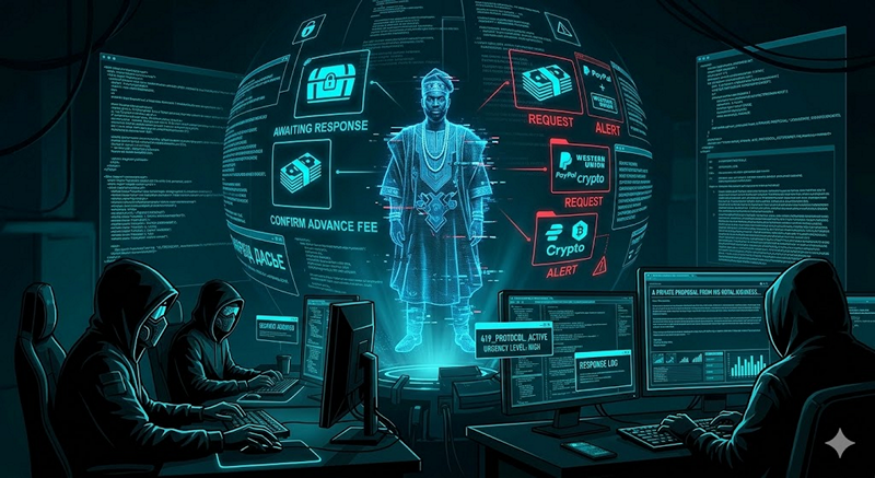 «Нігерыйскі прынц» — самы стары, даінтэрнэтны фішынг. Ілюстрацыя згенеравана БАЖ праз AI Nano Banana