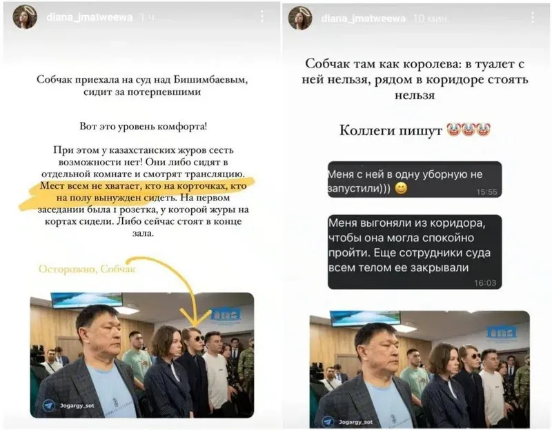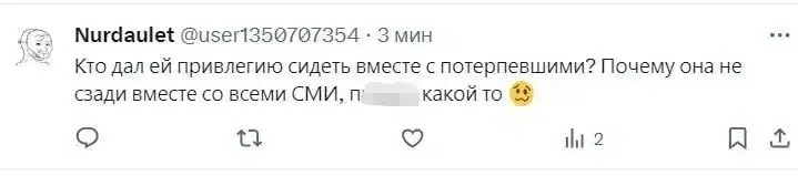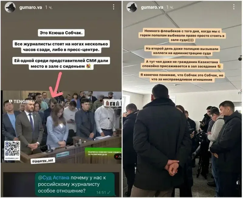 Снимки с Ксенией Собчак в зале суда быстро разлетелись по соцсетям и привлекли внимание казахстанцев. Приезд российской журналистки вызвал негодование у казахстанских представителей СМИ, по их мнению, ведущей оказывалось «особое отношение». Журналистка Асем Гумарова рассказала, что Собчак предоставили сиденье, пока остальные работники СМИ стояли.