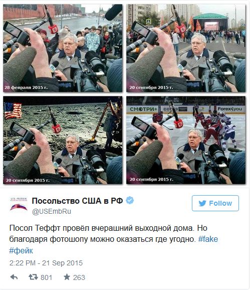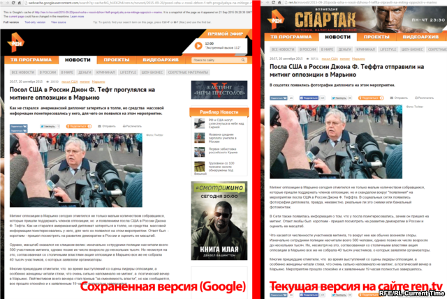 Расейскі тэлеканал REN TV праілюстраваў нататку аб нядзельным мітынгу ў Маскве змантажаваным фота амэрыканскага амбасадара ў Расеі. На ім Джон Тэфт нібыта выступае перад журналістамі 20 верасьня.