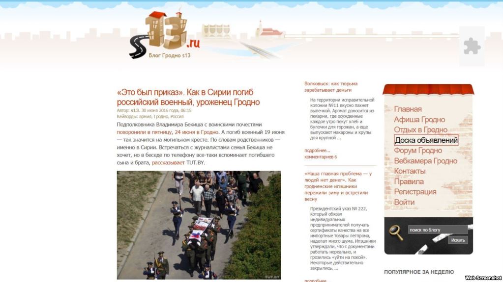 Гарадзенскі сайт s13.ru атрымаў паведамленьне ад Раскамнагляду аб блякаваньні ў сувязі з тым, што артыкул на сайце «Гэта быў загад. Як у Сырыі загінуў расейскі вайсковец, ураджэнец Горадні», зьмяшчае заклікі да масавых беспарадкаў, ажыцьцяўленьня экстрэмісцкай дзейнасьці, альбо ўдзелу ў масавых мерапрыемствах, якія праводзяцца з парушэньнем заканадаўства.