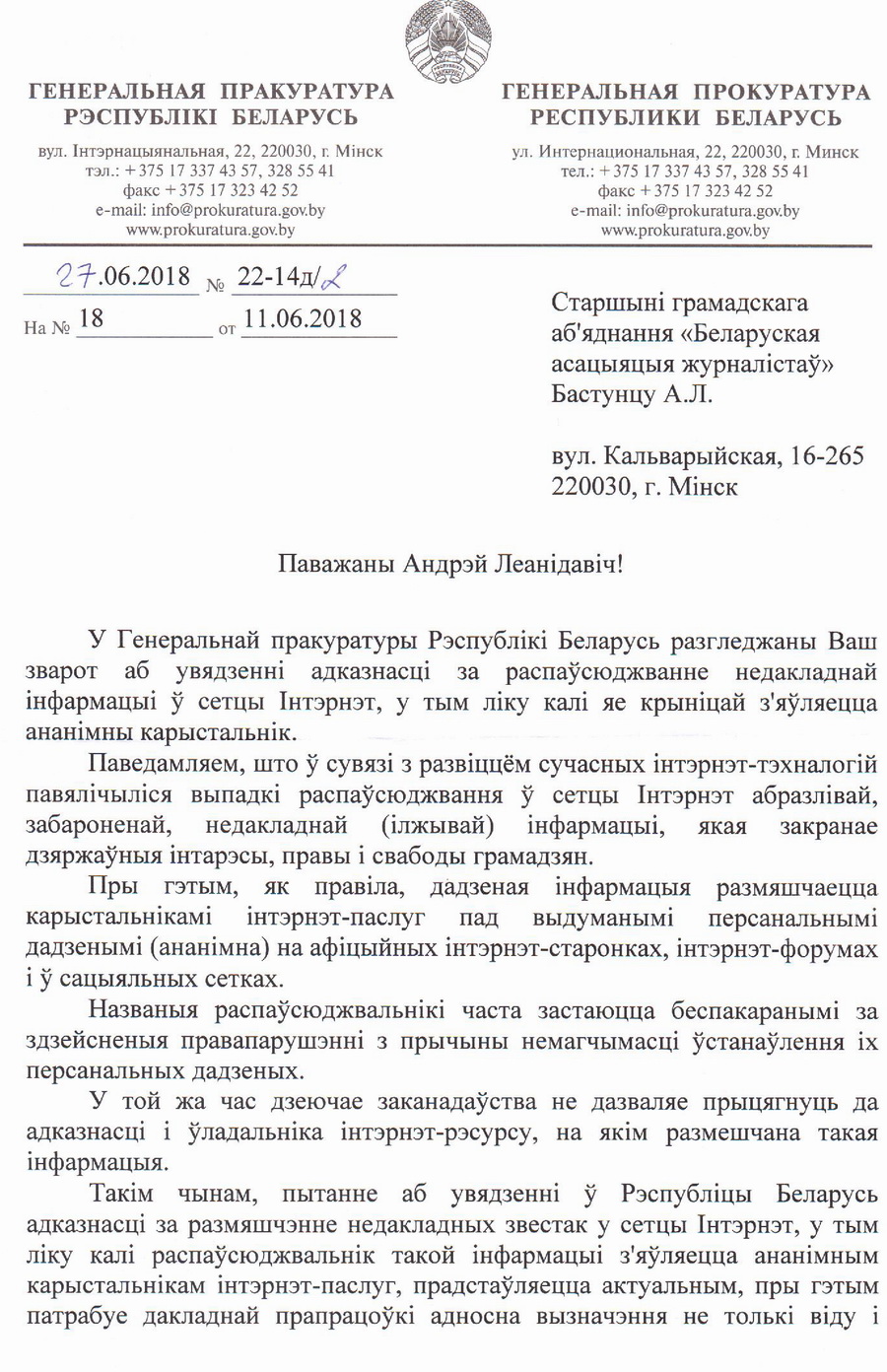Пры гэтым, як правіла, дадзеная інфармацыя размяшчаецца пад выдуманымі персанальнымі дадзенымі (ананімна) на інтэрнэт-старонках, форумах і ў сацыяльных сетках», — гаворыцца ў адказе Генеральнай пракуратуры Беларусі на запыт ГА «БАЖ».