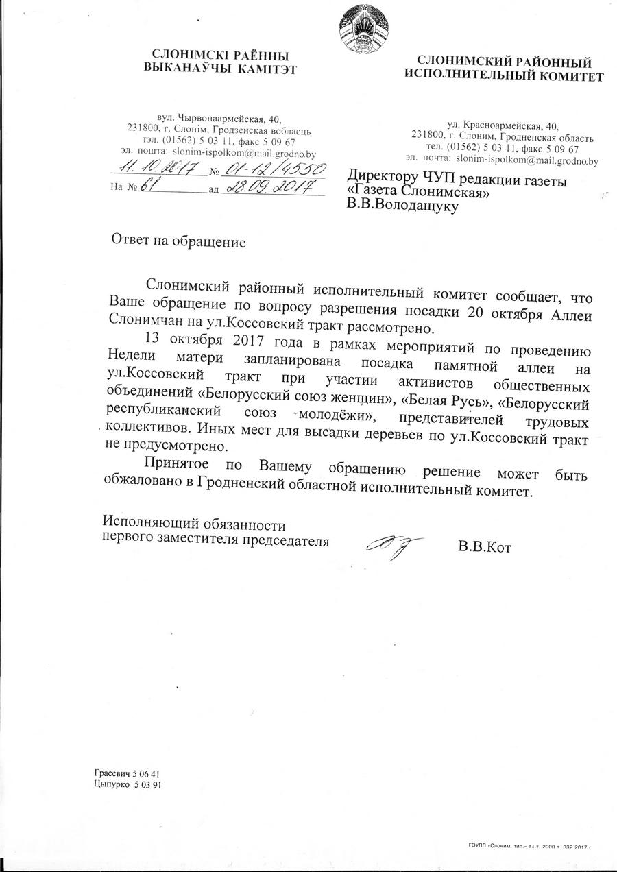 І вось 12 кастрычніка з выканкама прыйшоў афіцыйны адказ на запыт, у якім чытаем: “13 кастрычніка 2017 года ў рамках мерапрыемстваў па правядзенню Тыдня маці запланавана пасадка памятнай алеі на вул. Косаўскі тракт пры ўдзеле актывістаў грамадскій аб’яднанняў “Беларускі саюз жанчын”, “Белая Русь”, “Беларускі рэспубліканскі саюз моладзі”, прадстаўнікоў працоўных калектываў. Іншых месцаў для высадкі дрэваў па вул. Косаўскі тракт не прадугледжана”.