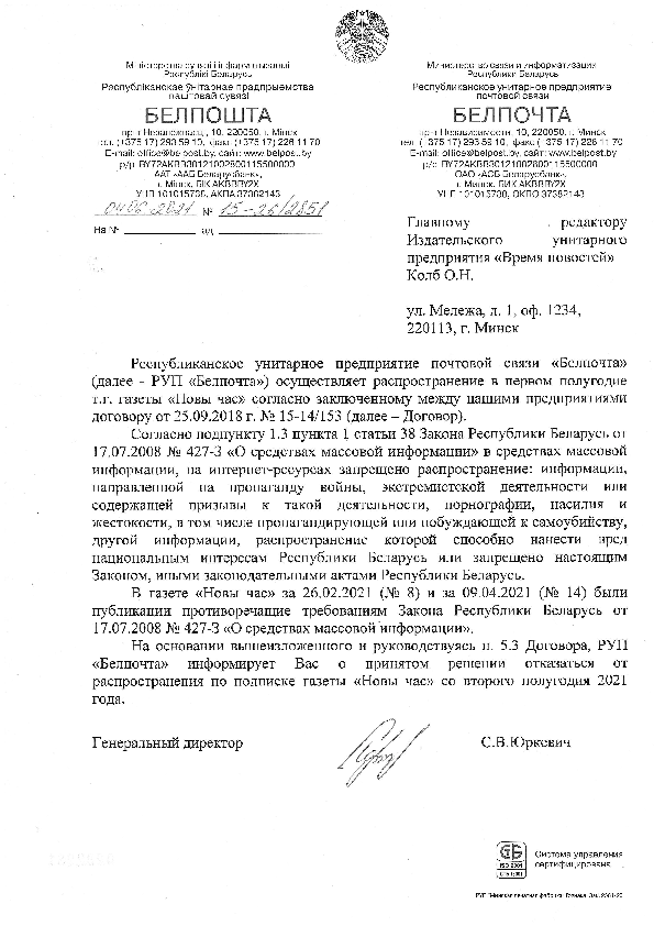 Абноўлена: ліст даслалі на элетронную пошту. Высветлілася, што такім чынам кіраўніцтва «Белпошты» адрэагавала на папярэджанне Генпракуратуры галоўнаму рэдактару.