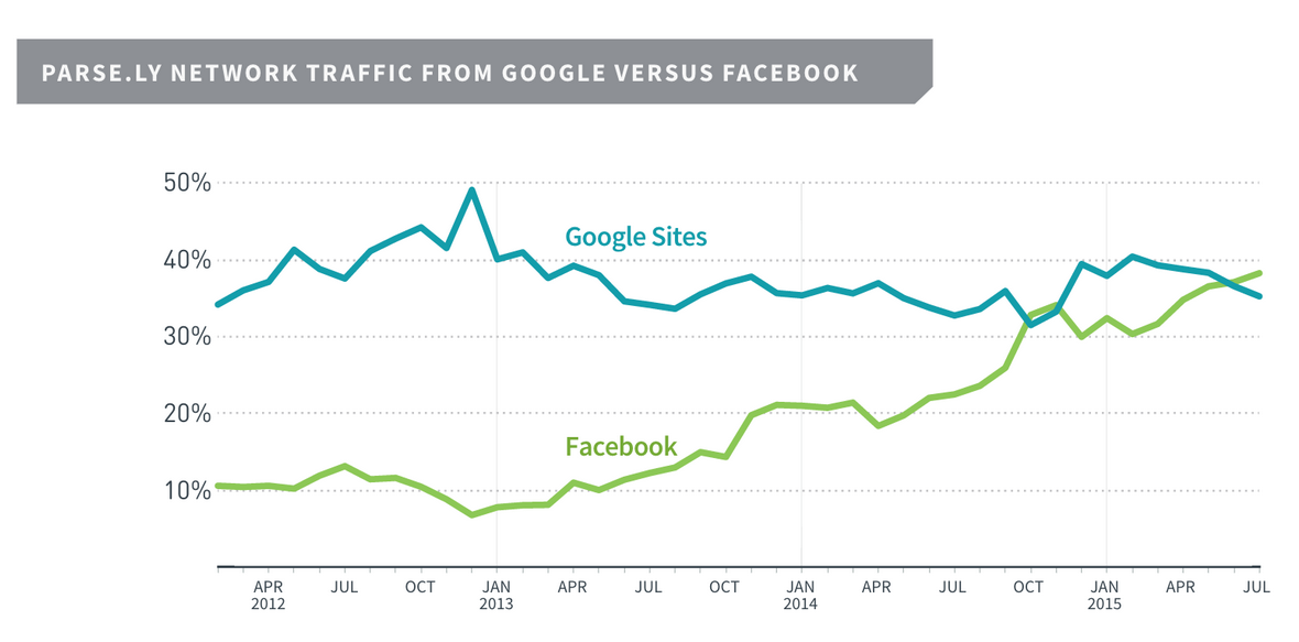 У жніўні 2015 года даследчая фірма Parse.ly зафіксавала перавагу пераходаў з Facebook на навінныя сайты перад пераходамі з пошуку Google (цяперашні сусветны лідар у гэтай галіне).