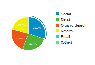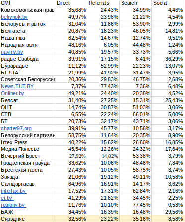 У старых медыйных праектах усё яшчэ мае вялікае значэнне лаяльная аўдыторыя, якая набірае адрас сайта ў браўзеры (Direct), і паказчыкі прыходу на сайт па пошуку (Search). Трэцім па важнасці аказваецца канал трафіку спасылкі з іншых сайтаў (Referral) і вельмі нізкія паказчыкі трафіку з сацыяльных сетак (Social).