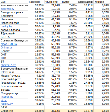 З якіх сацыяльных сетак беларускія медыя маюць большую карысць? Калі браць сярэднія паказчыкі, то на першае месца, як і ва ўсім свеце, выходзіць Facebook (38,26 %), а на другое месца — «ВКонтакте» (36,12 %).