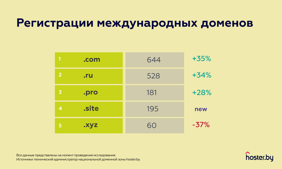Регистрации международных доменов в первой половине 2021 года значительно подросли по сравнению с аналогичным периодом прошлого года. Рост количества зарегистрированных международных доменов достигает 35% (например, в зоне .com). Можно предположить, что такие изменения говорят об ослаблении доверия пользователей к белорусскому интернет-пространству.
