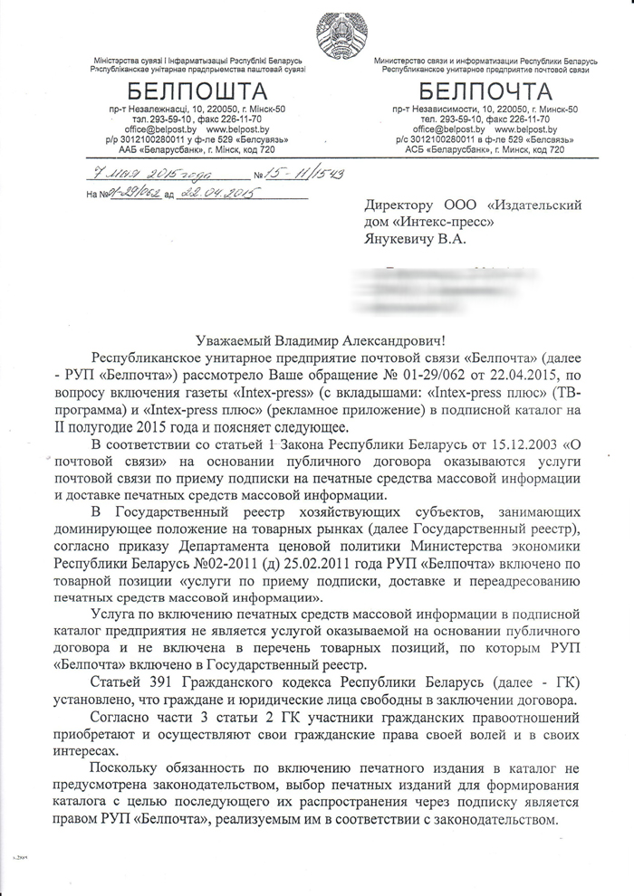 «В связи с установлением факта отсутствия нарушения законодательных актов, послужившего основанием для принятия решения об ограничения доступа к интернет-ресурсу, а также иных нарушений в пределах своей компетенции приказываю: возобновить доступ к интернет-ресурсу с идентификаторами www.intex-press.by и intex-press.by», – говорится в письме за подписью министра информации, поступившем в редакцию 9 февраля.