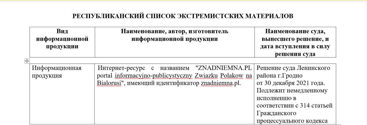 Інфармацыйную прадукцыю сайта znadniemna.pl, партала незарэгістраванага Саюзу палякаў у Беларусі прызналі экстрэмісцкімі матэрыяламі.