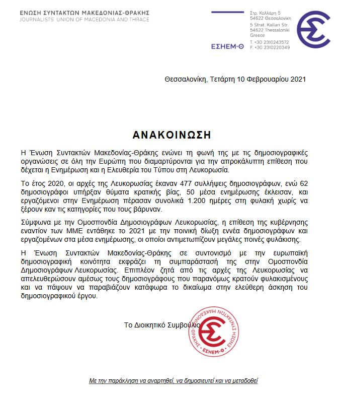 Кіраўнік Саюза журналістаў Македоніі і Фракіі (Journalists' Union of Macedonia and Thrace) Ніколас Карас накіраваў ліст у пасольства Беларусі ў Грэцыі з патрабаваннем вызваліць зняволеных беларускіх журналістаў.