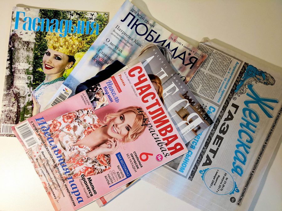 Сярод дзясяткаў часопісаў і газет у шапіках «Белсаюздруку» ільвіную долю займаюць так званыя жаночыя выданні. «Elle», «Cosmopolitan», «Vogue» — гэта ўсё пра далёкіх і блізкіх суседзяў, але і свае ўласныя прадукты мы таксама маем.