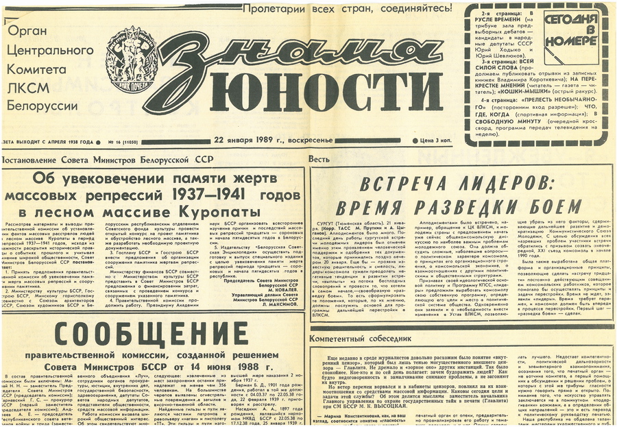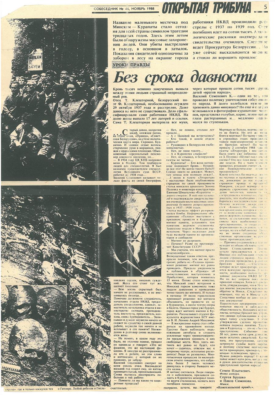 У 1988 годзе публікацыя пра масавыя забойствы ў Курапатах стала шокавай для грамадства. Навіна пра тое, што ва ўрочышчы пад Мінскам мірных беларусаў тысячамі расстрэльвалі «свае» — супрацоўнікі НКУС, — перавярнула свядомасць людзей.