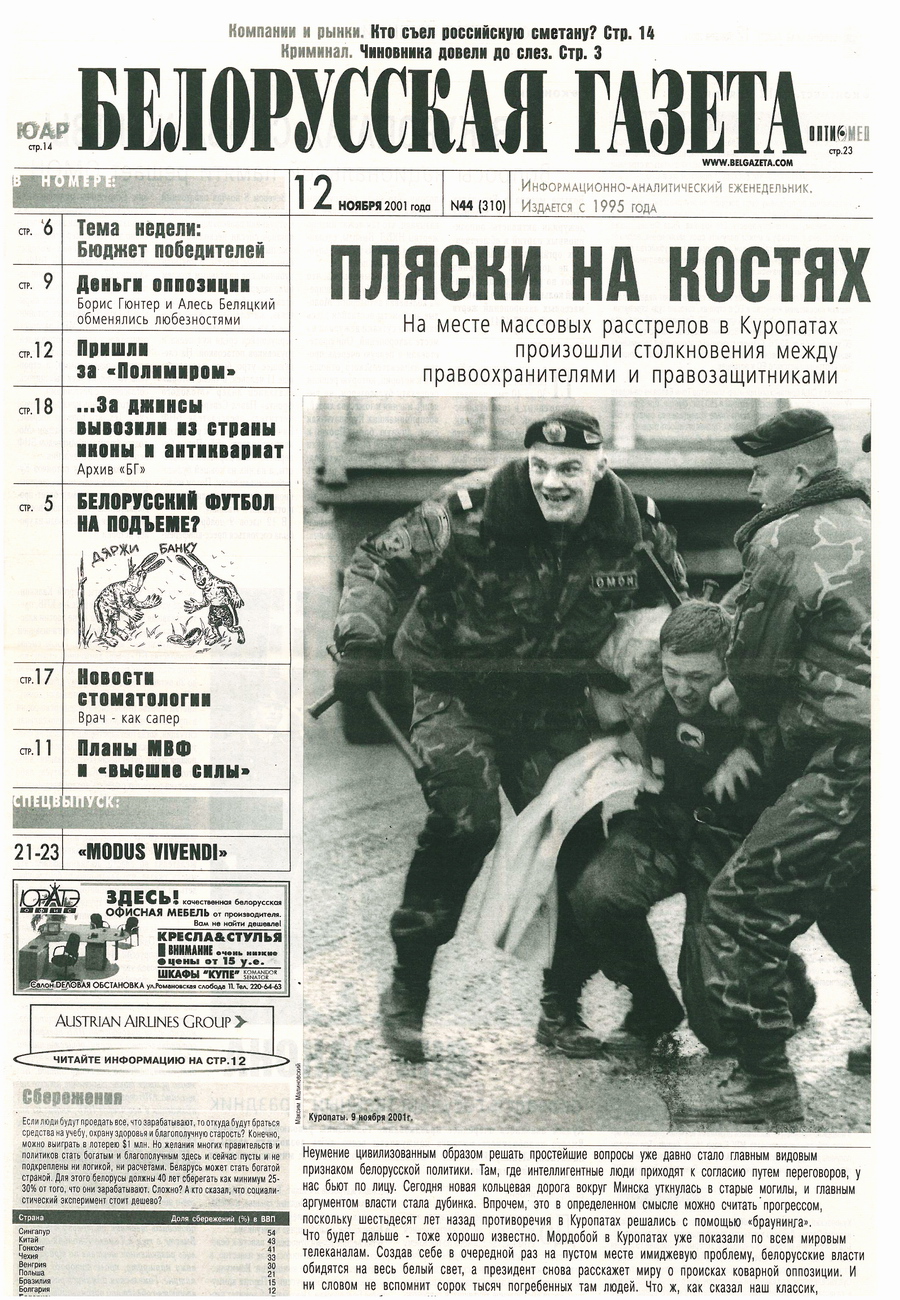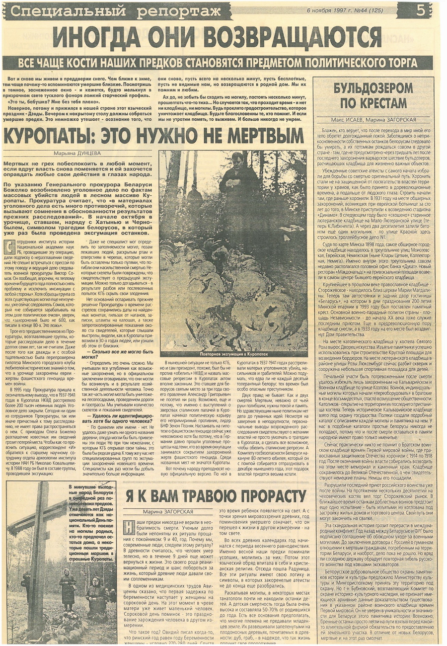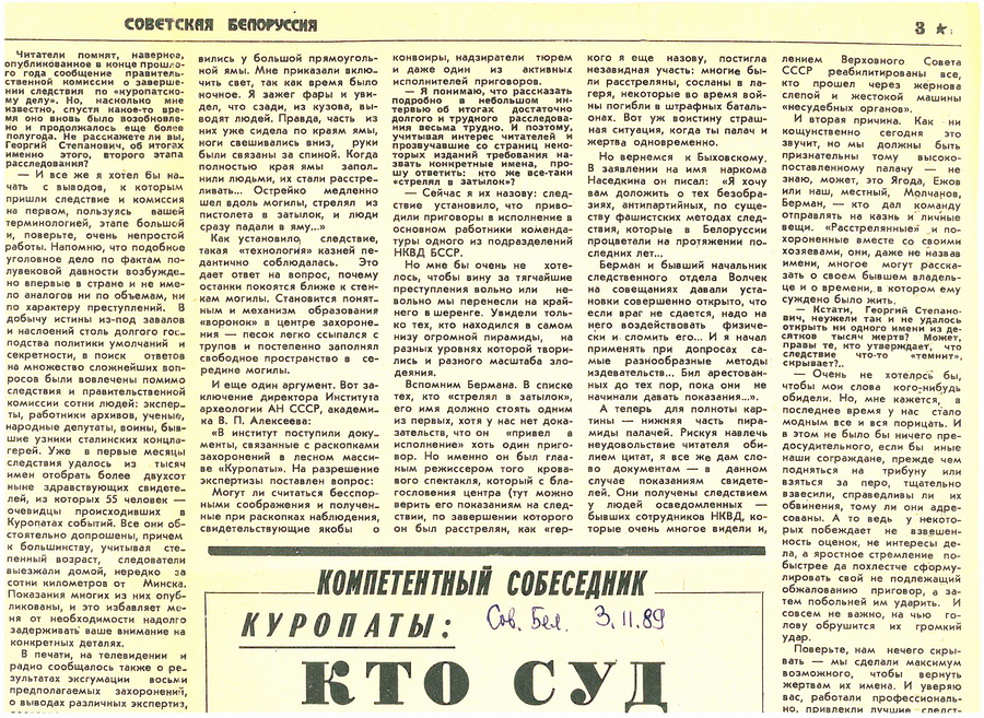 «Название маленького местечка под Минском — Курапаты стало сегодня для все страны символом трагедии тридцатых годов. Счет идет на сотни тысяч. Следствие ведет Прокуратура Белоруссии… Но уже сейчас высказываются мнения: а стоило ли ворошить прошлое?