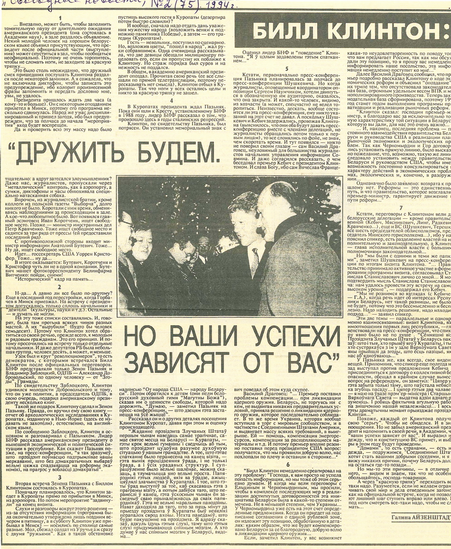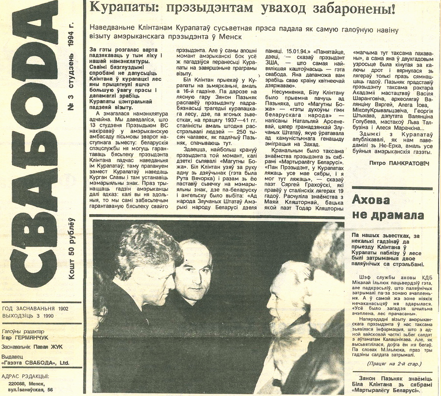«Біл Клінтан прыехаў у Курапаты на змярканні. Па дарозе на лясную гару Зянон Пазняк распавёў прэзідэнту падрабязнасці трагедыі курапацкага лесу, дзе на працягу 1937–41 гг. сталіністы амаль штодня расстрэльвалі людзей.