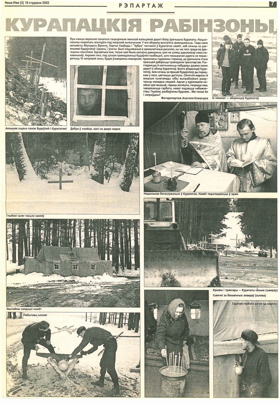 А гэта ўжо амаль найноўшая гісторыя — супрацьстаянне ў Курапатах падчас пашырэння мінскай кальцавой дарогі ў 2001‑м годзе. Адразу пасля прэзідэнцкіх выбараў улады ўзяліся пашыраць МКАД у раёне Курапатаў, а апазіцыйная моладзь амаль год супрацьстаяла гэтаму. Была распачата кругласуткавая варта, якая пратрывала больш за 8 месяцаў.