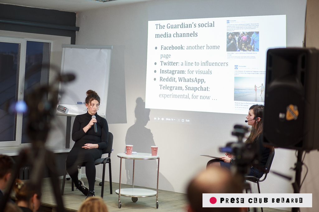 Рэдактар «The Guardian» па працы з сацыяльнымі сеткамі Мэйв Шэрлаў на сустрэчы ў Мінску расказала, як працуе яе СМІ і як журналісцкія гісторыі трапляюць на анлайн-старонкі выдання. Сустрэча з Мэйв Шэрлаў адбылася ў межах “Прэс-клуба Беларусь” у пятніцу, 29 студзеня.