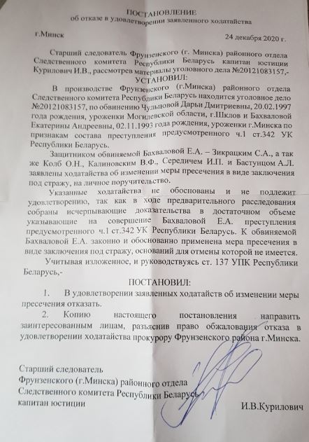 Старэйшы следчы Фрунзенскага (г. Мінска) раённага аддзела Следчага камітэта І. Курыловіч у сваёй пастанове, якая была дасланая заяўнікам, называе хадайніцтвы неабгрунтаванымі, таму яны не могуць быць задаволеныя.
