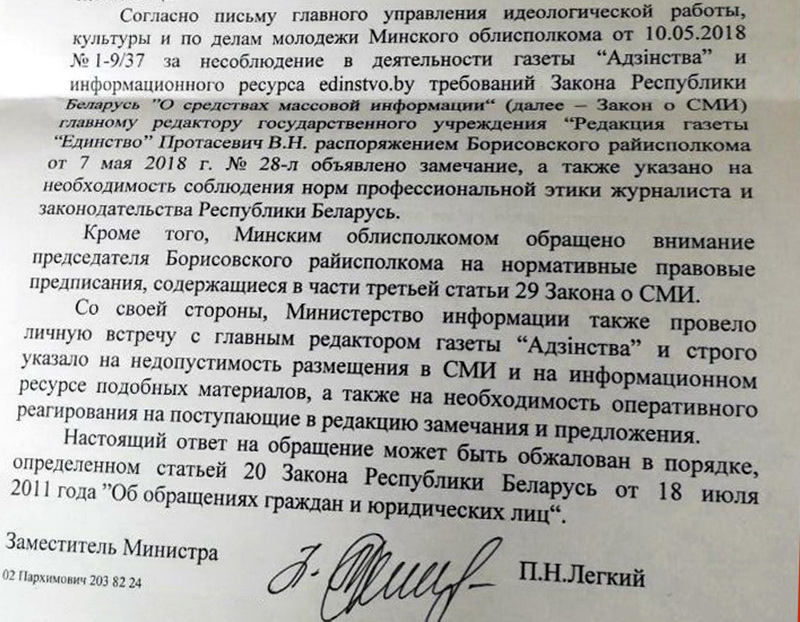 Борисовский райисполком за несоблюдение в деятельности газеты «Адзінства» и информационного ресурса edinstvo.by требований Закона Республики Беларусь «О средствах массовой информации» редактору государственного учреждения «Редакция газеты «Единство» Вере Протасевич 7 мая 2018 года объявил замечание.
