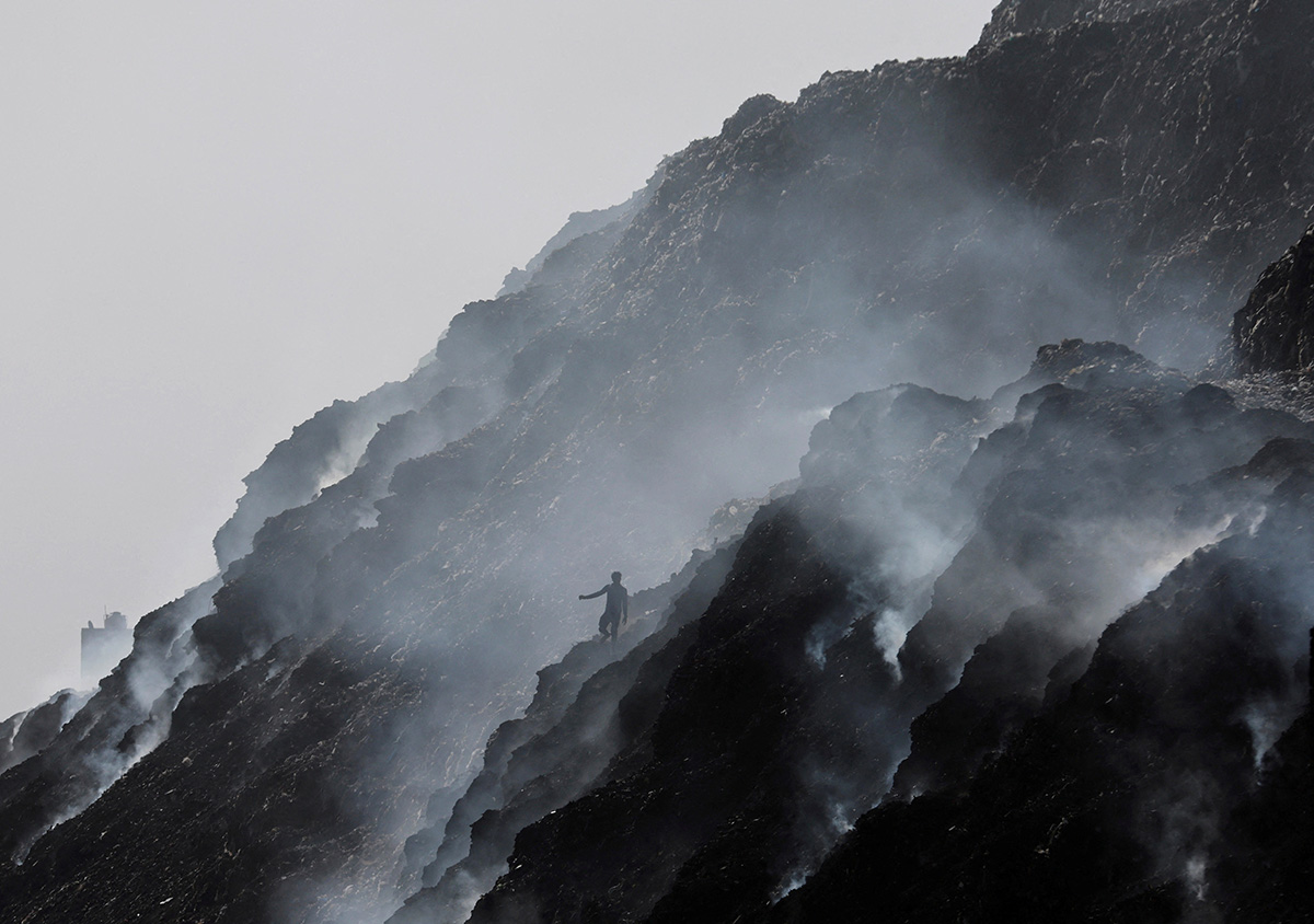 Сборщик мусора в поисках материалов, пригодных для вторичной переработки, идет сквозь клубы дыма от пожара на свалке Бхалсва во Всемирный день окружающей среды в Нью-Дели, Индия, 5 июня 2022 года. Не первый год Индия сталкивается в проблемой загрязнения воздуха, воды и почвы. В этом году страна заняла последнее место в мировом рейтинге экологической эффективности. Фото: Reuters