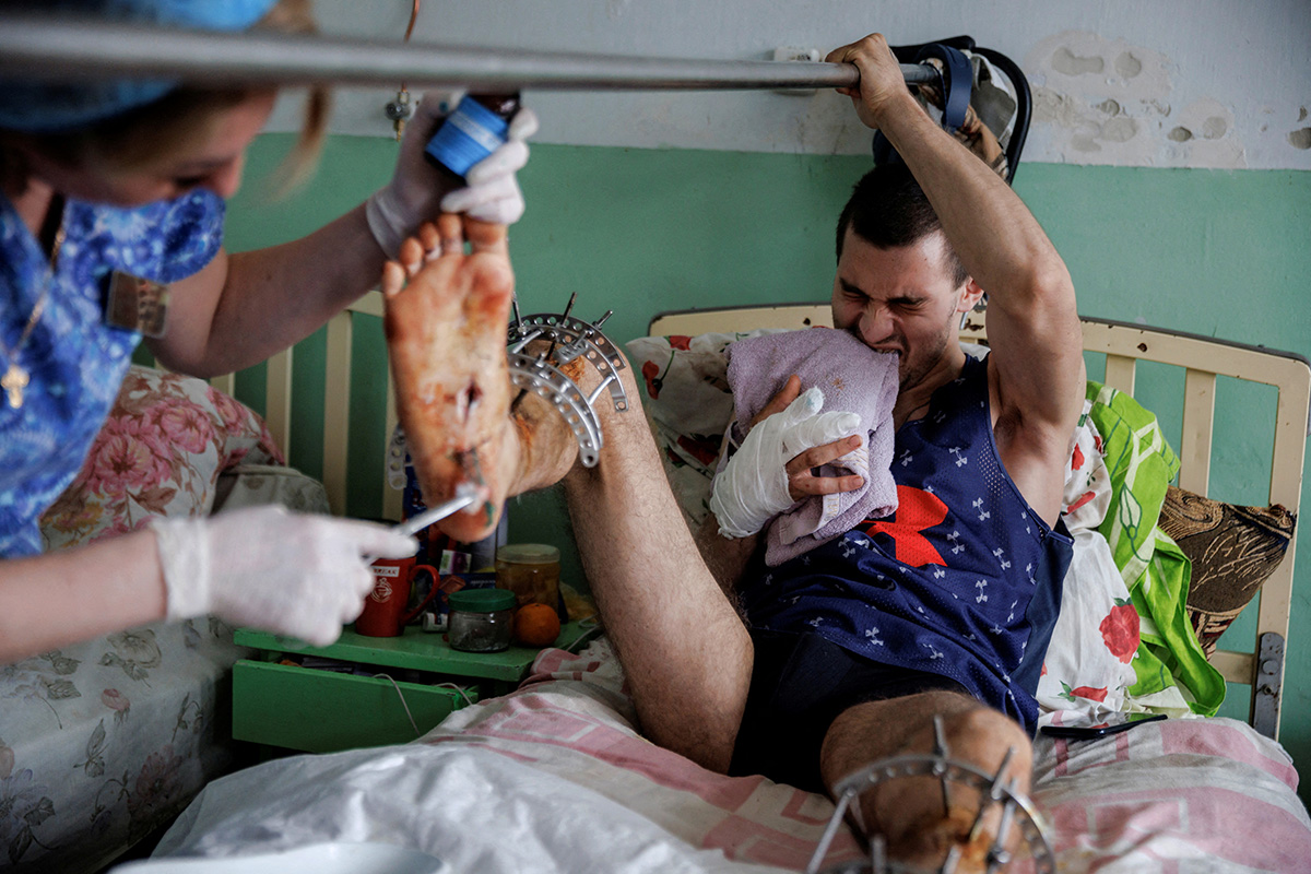 Медсестра обрабатывает раны мужчины, который был ранен во время ракетного обстрела под Харьковом, больница города Чугуев Харьковской области, Украина, 1 апреля 2022 года. Фото: Reuters