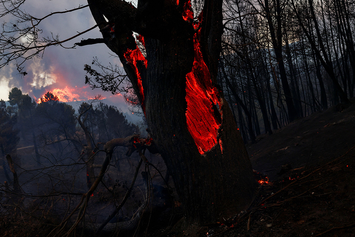 Горящее изнутри дерево на фоне лесного пожара в районе Видемонте, муниципалитет Селорику-да-Бейра, Португалия, 11 августа 2022 года. В июне на большей части территории Европы температура составляла +40…+43 °C, были побиты сотни ежедневных и месячных температурных рекордов. Наиболее высокая температура была зарегистрирована 14 июля в Алижо в Португалии и составила +47 °C. Аномальная жара привела к крупным лесным пожарам и тысячам смертей по всей Европе в целом. Фото: Reuters