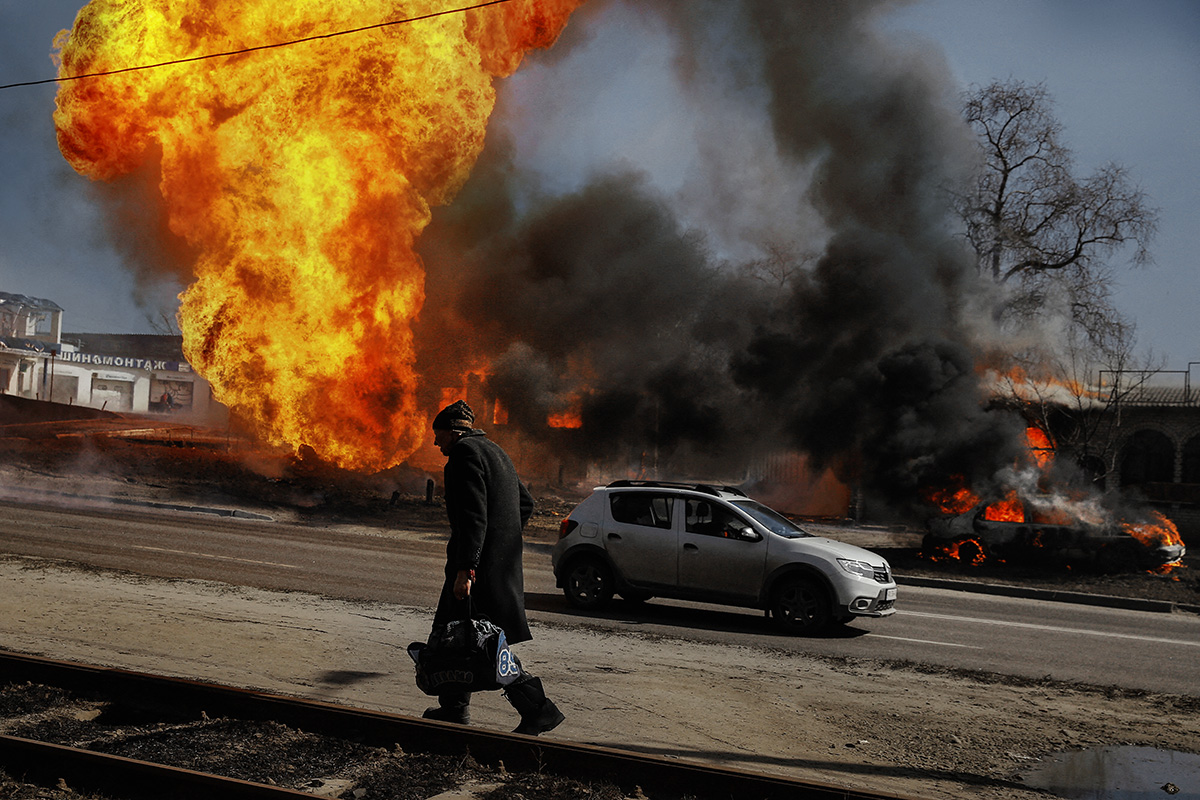 Мужчина проходит мимо пожара после российского обстрела Харькова, Украина, 25 марта 2022 года. Фото: Reuters