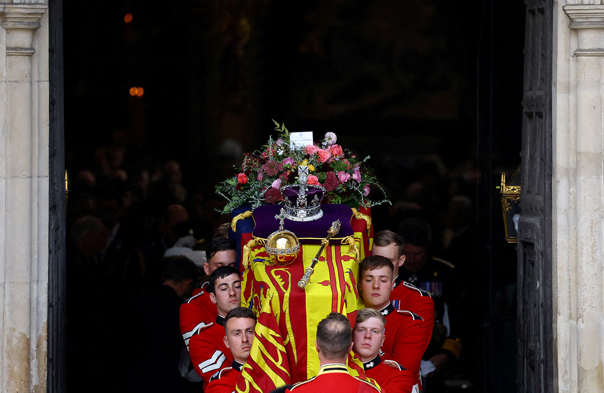 Гроб британской королевы Елизаветы II выносят из Вестминстерского аббатства после поминальной службы в Лондоне, Англия, 19 сентября 2022 года. 8 сентября на 97‑м году жизни скончалась королева Великобритании Елизавета II. С момента смерти и до окончания похоронных церемоний в стране был объявлен национальный траур. Царствующим королем Великобритании был объявлен Карл III. Фото: Reuters.