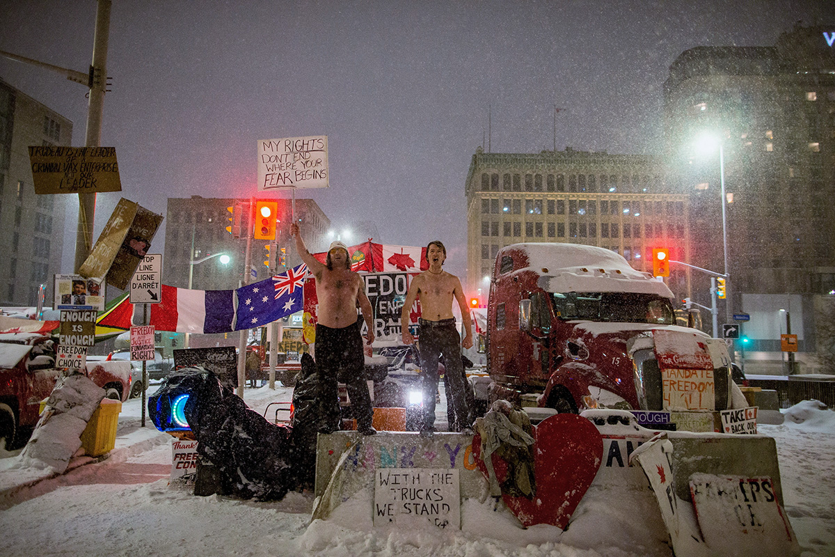 Два человека скандируют лозунги возле парламента Канады во время многодневной акции протеста дальнобойщиков, выступавших против обязательной вакцинации водителей грузовых фур, Оттава, Онтарио, Канада, 17 февраля 2022 года. Фото: Reuters.