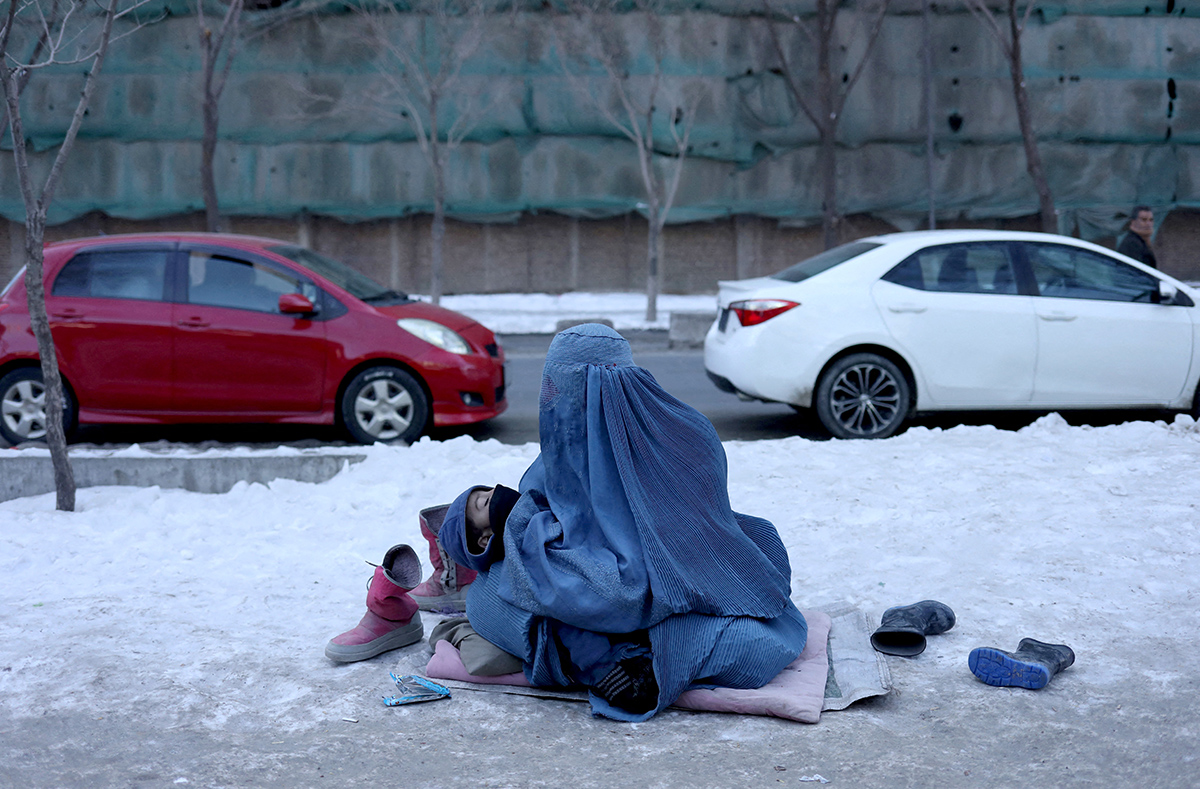 Афганская женщина с ребенком на руках просит милостыню на заснеженном тротуаре в Кабуле, Афганистан, 27 января 2022 года. Движение «Талибан», которое правит в Афганистане с момента ухода американских войск, проводит политику ограничения влияния женщин на жизнь внутри страны. В ноябре талибы издали указ, запрещающий женщинам посещать парки развлечений, общественные бани, рестораны, спортивные залы и стадионы. Эти ограничения были введены министерством по поощрению добродетели и предотвращению порока; женщин предупредили, что если они не подчинятся, к ним будут приняты строгие меры. Фото: Reuters.
