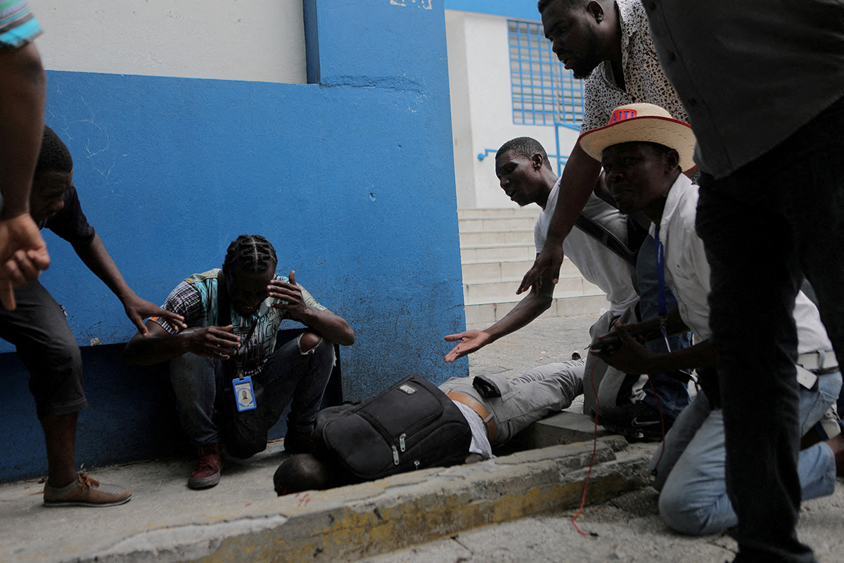 Демонстранты и репортеры стоят рядом с телом гаитянского журналиста Ромельсона Вильсента возле полицейского участка. Он скончался после выстрела в голову, когда полиция открыла огонь по репортерам, требующим освобождения одного из своих коллег, который был задержан во время освещения акции протеста, Порт-о-Пренс, Гаити, 30 октября 2022 года. Фото: Reuters.