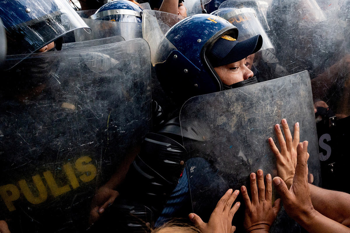 Полицейские блокируют активистов во время акции протеста против провозглашения нового президента и вице-президента Филиппин перед зданием Комиссии по правам человека в Кесон-Сити, 25 мая 2022 года. В Маниле президентскую присягу принял Фердинанд Маркос-младший — 64-летний сын диктатора Фердинанда Маркоса, который правил страной с 1965 по 1986 год. Вице-президентом стала Сара Дутерте — дочь уходящего президента Родриго Дутерте. Фото: Reuters.