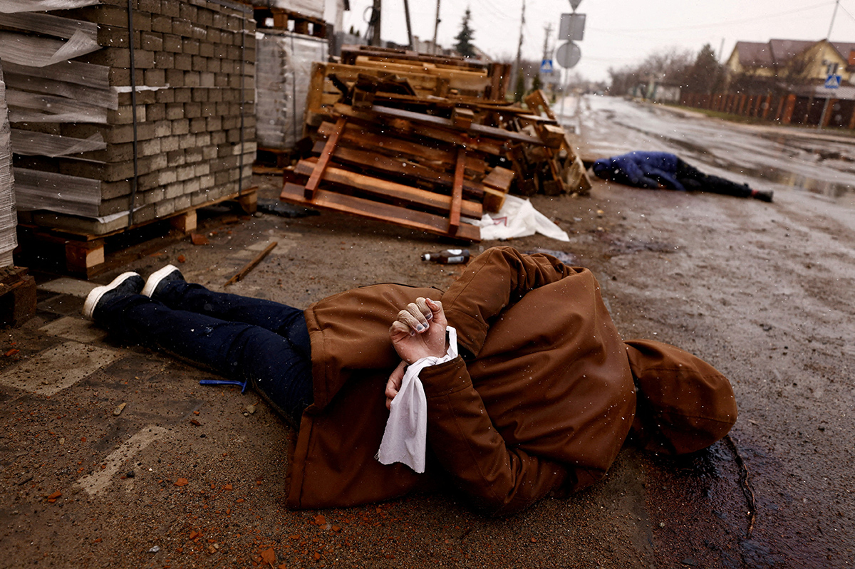 Тело убитого жителя города Буча лежит на улице со связанными белой тканью руками, Буча, Украина, 3 апреля 2022 года. Фото: Reuters.