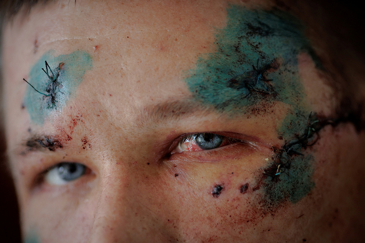 Сергей, получивший травмы головы и потерявший пальцы во время ракетного обстрела своего села, на больничной койке в Чугуеве под Харьковом, Украина, 1 апреля 2022 года. Фото: Reuters.