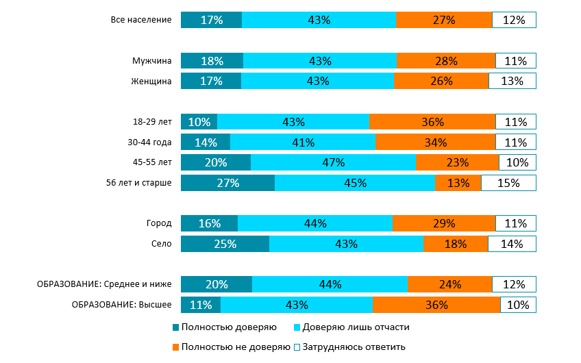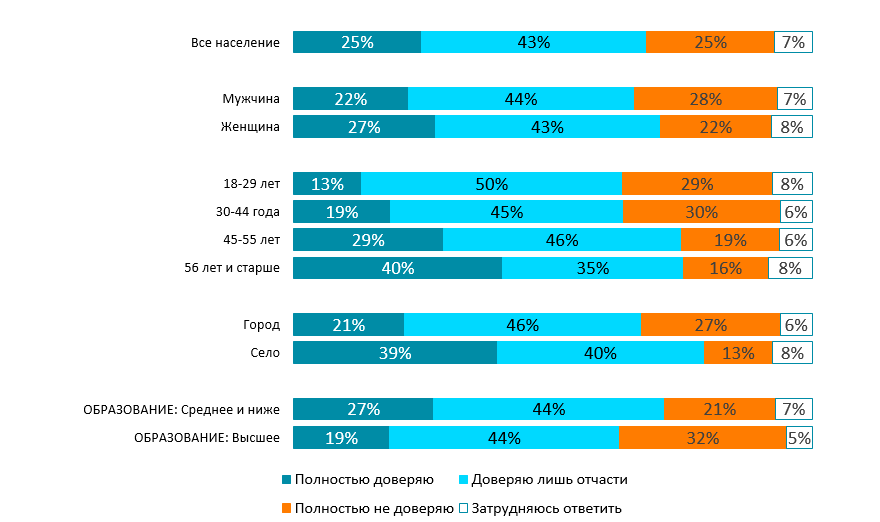 Если суммировать ответы «Полностью доверяю» и «Доверяю лишь отчасти», то получится 68%. Полностью не доверяют 25% участвовавших в опросе.