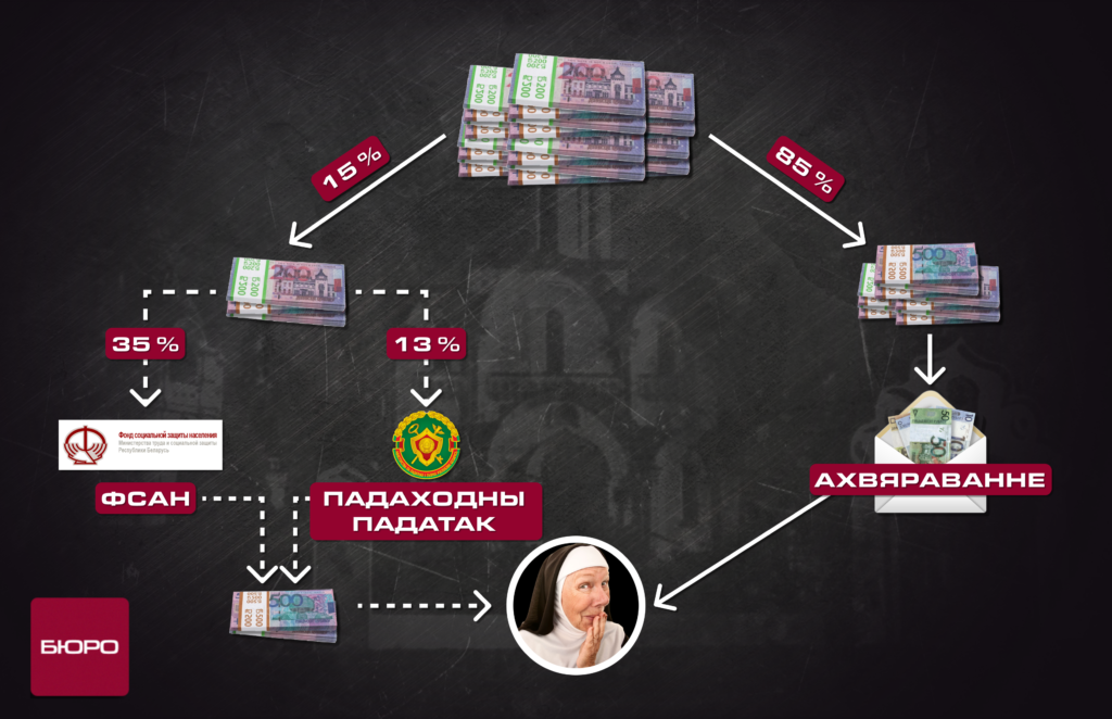 Журналісты «Бюро» высветлілі, як Свята-Елісавецінскі жаночы манастыр зарабляе мільёны на шэрых схемах і як гэтая дзейнасць звязаная з атачэннем сям’і Лукашэнкі. Ілюстрацыя: buromedia.io