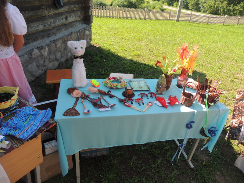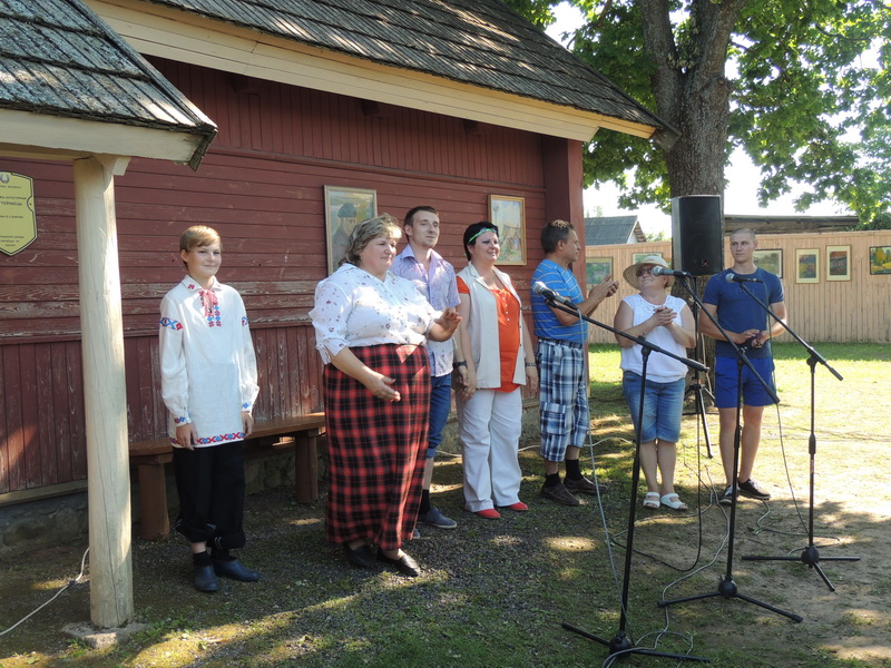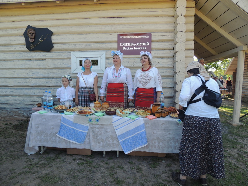 Наступны пункт — Бычкі. Каля дома-музея ўжо сабралася шмат людзей. Гасцей сустракаюць жанчыны ў нацыянальных строях, яны прапануюць розныя пачастункі і халодную ваду з калодзежа. Ад апошняга складана адмовіцца, бо тэмпература паветра нават не думае змяншацца. Наводдаль знаходзяцца сталы з сувенірамі, там жа можна паўдзельнічаць у бяспройгрышнай латарэі. Як гэта звязана з пісьменнікам, не зусім зразумела.